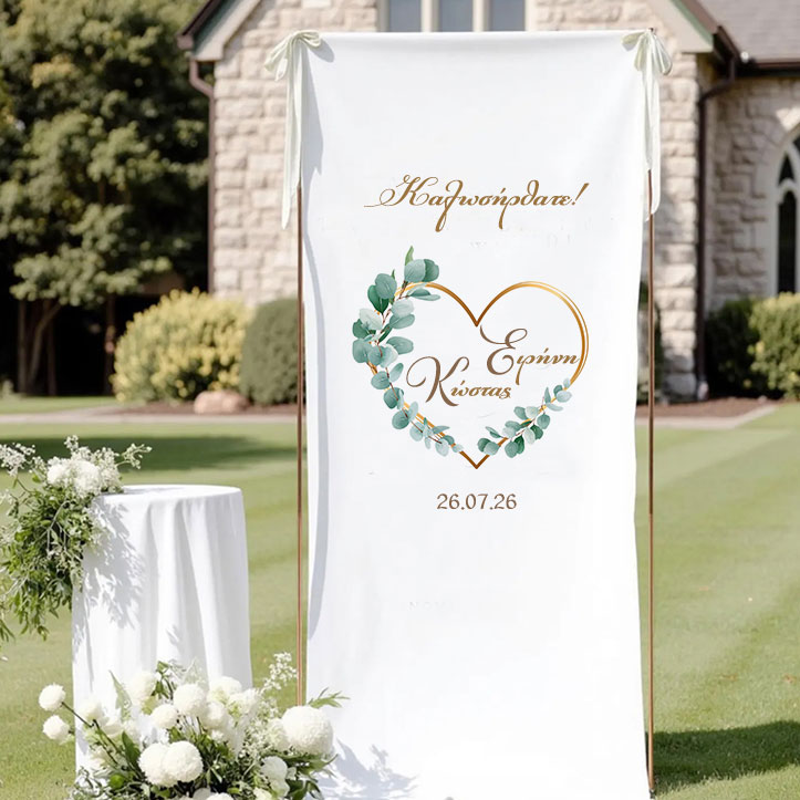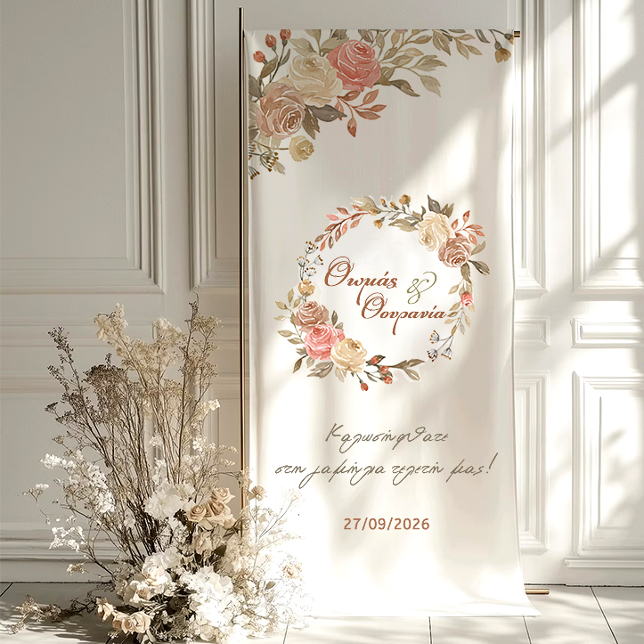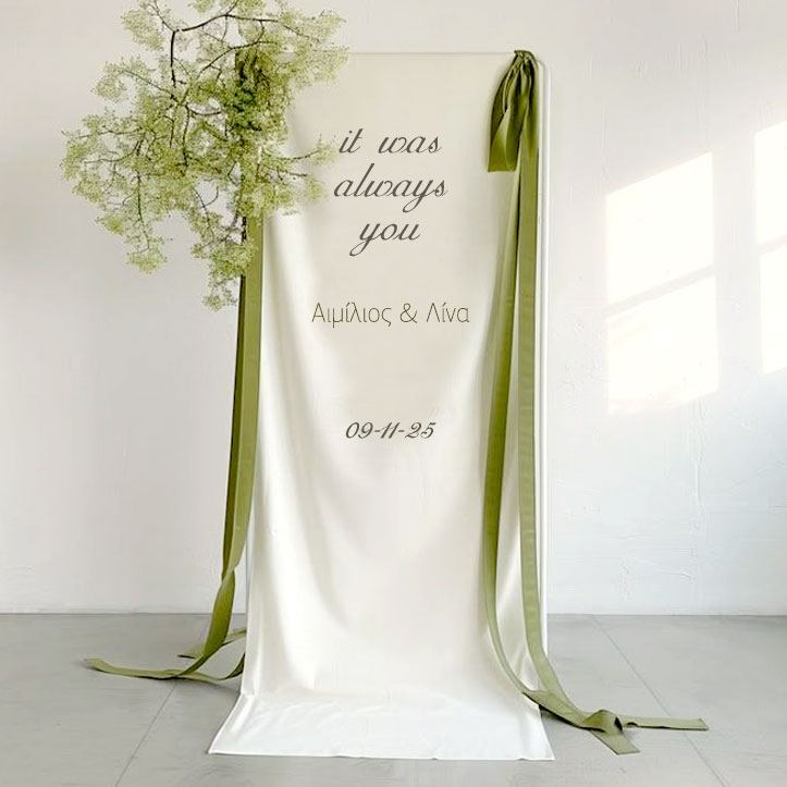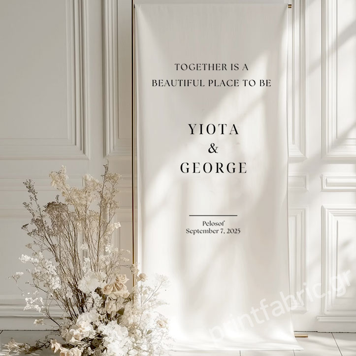 Υφασμάτινη Αφίσα Backdrop σε οποιαδήποτε διάσταση και σχήμα. Τετράγωνη, μακρόστενη, κάθετη, στρογγυλή, ψηφιακά εκτυπωμένο το θέμα του γάμου, της βάπτισης-Party και οποιοδήποτε event. Προσωποποιημένη με ονόματα, ημερομηνία, . . .