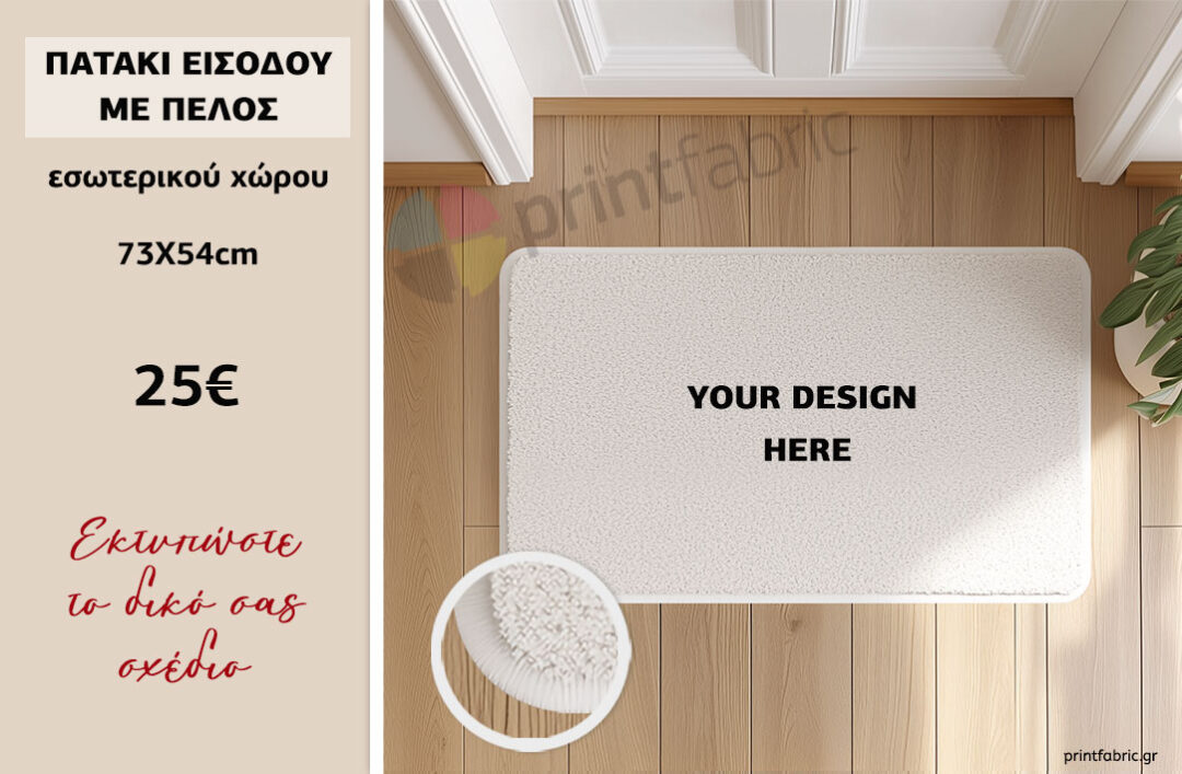Πατάκι εισόδου δωματίου (εσωτερικού χώρου) με πέλος εκτυπωμένο με δικό σας σχέδιο. Διάσταση 73Χ54εκ. 25€